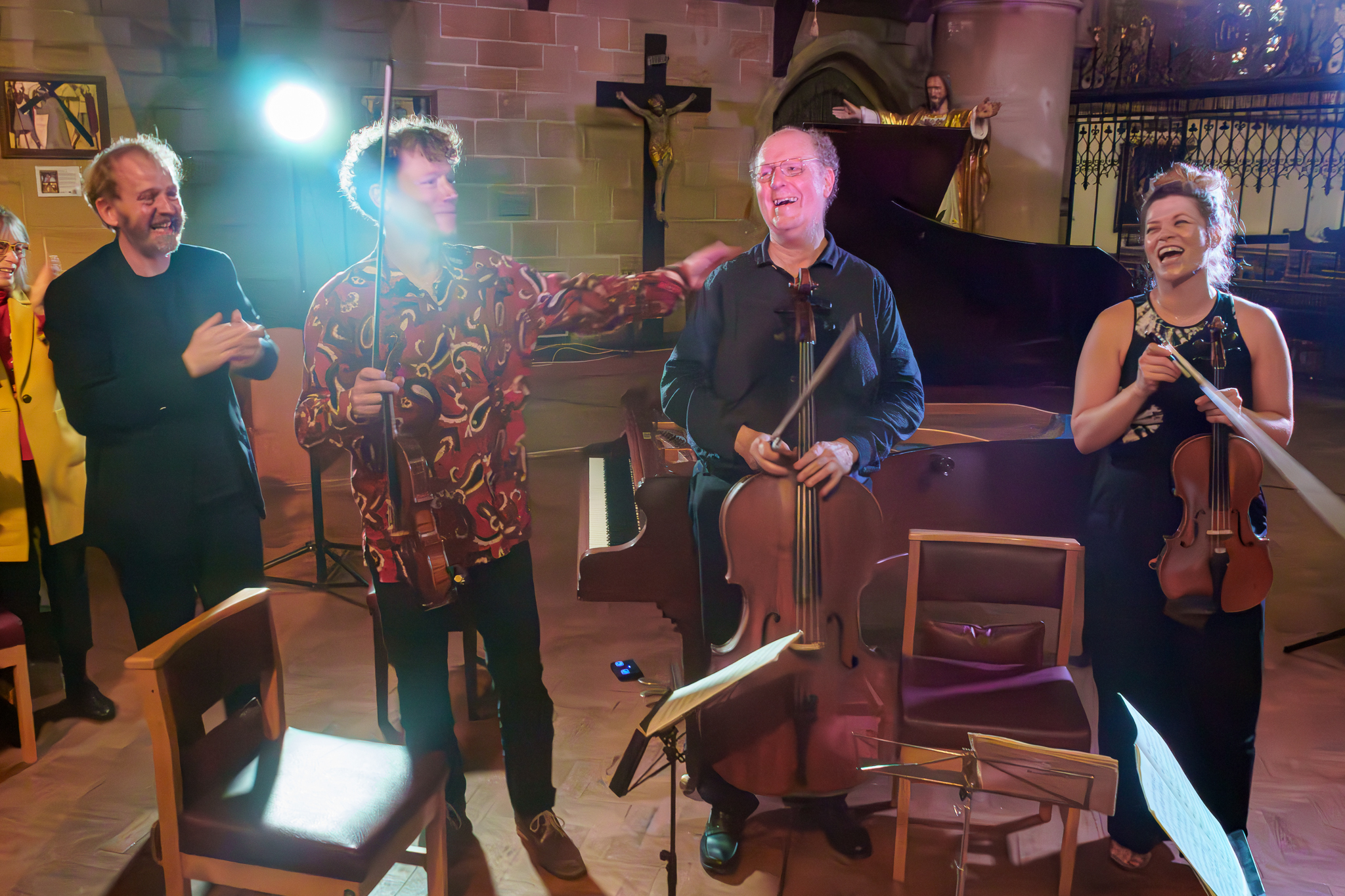 The enthusiasm of the audience is always apparent in Christ Church, not least because most people know one another and everyone greets everyone – in the interval there was quite a party atmosphere. People settled, however, and the trio were joined by Anne Beilby, a notable viola player, for the Brahms. The contrast between the two compositions, (pointed out by Baillie in his introduction) became particularly apparent. Brahms’ melodies are stately, more marked, less surprising than Beethoven’s. The drama of this piece is in the dynamics, the build, the depth, the song-like development, the fortes and the pianos, the emphasis on the lower register and the melodic swell and ebb. In the first movement, the piano talks to the strings (in contrast to the Beethoven Trio where the strings talk among themselves and have an independent conversation with the piano). In the second, the cello forms a shelf of dizzy triplets underpinning the other strings and piano in a lyrical melody which rises in intensity then fades twinkling away. There’s a beautifully elegant third movement with a kind of dance in the middle in a slow three, and a breathtakingly fast, virtuoso-difficult fourth movement.
